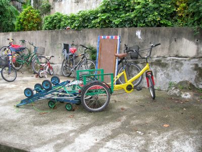 荷物運搬用に改造された三輪車。 ここまで来るのに坂を越えなければならないので、この自転車でここまで荷物を運ぶのは少し大変でしょう。 |