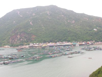 尾根道を進むと、目の前に湾と民家が見えてきました。 この湾は、索罟湾(Sok Kwu Wan)といいます。民家が見えるところが今日のゴール。 フェリーターミナルがあります。 湾の中には数多くのいけすがありました。 |