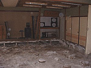 旧館の1階を自転車置き場に開放してくれました。廊下に自転車を置いて荷物を解いてふと大広間の方へ目をやると、目を疑うような光景。