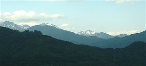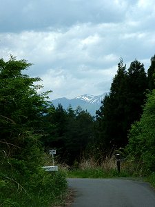 途中、桑畑の向うに雪をいただいた山が見えました。一休み