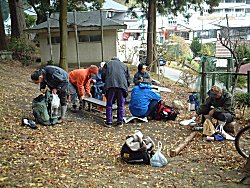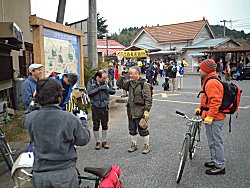 約1時間掛けて養老渓谷駅に到着。駅が騒然としています。 紅葉狩りのファミリーハイキングが開催されるということで、大勢の人が集まっていました。 傍らで開催の挨拶を今関さんが述べ、そのあと、自己紹介をして、走り出します。 駅前のコンビニでビールを買うのも忘れずに。 |