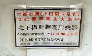 地球化学研究所の地下構造調査用機材でした。 しかも調べているのが、小田原〜足利 非常に広範囲です。連絡先が個人の携帯電話番号でした。 大分気になる調査です。 |
