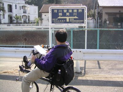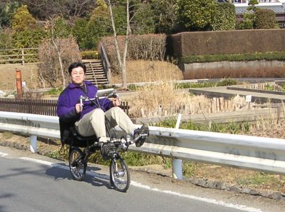 一路、海に向かって走りはじめます。 吉田さんは、お得意のリカンベント Bike Saturday で疾走しています。 |