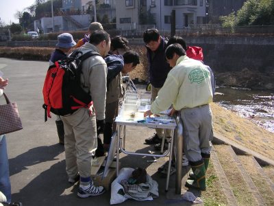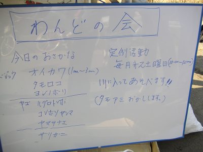説明していた人にお話しを伺うと、「わんどの会」という鶴見川の自然を守る会の人でした。 鶴見川には色々な魚がいるのにびっくりしました。 とくにヨシノボリ、オイカワの名前を見たときには、子供のころの記憶が蘇って来ました。 わんどの会の人に、ACFを少しアッピールして後にしました。 なお、この関山橋わんどは、小田急線の鶴川の上流にあります。 |