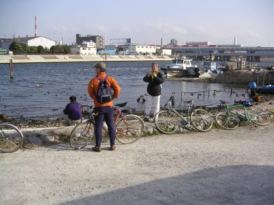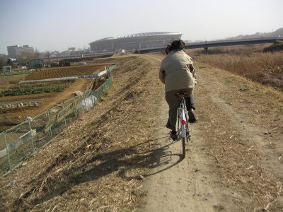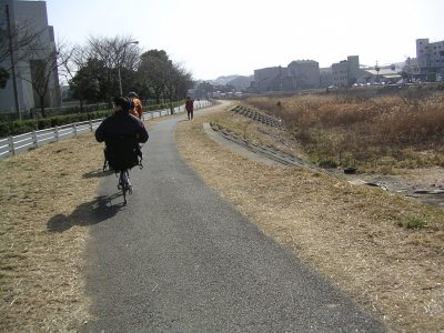 一見、のどかに走っていますが、この頃になると、春一番が吹き荒れ、逆風で非常に辛い思いをしながら走っています。 横風になると、ハンドルを取られる始末です。 土手を走っているので、落ちそうになり、結構恐い思いをしました。 |