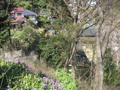 二ツ池から、ゴルフ場を右折、またまた急な坂を押して上ると、獅子ヶ谷の裏の尾根に出ます。 畑があり、右手には獅子ヶ谷の自然を見ることができます。 |