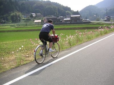 山を降りてくると、秋桜の出迎えです。 道路沿いに秋桜が続きます。 |