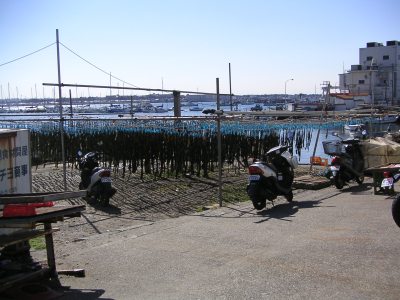 逗子駅から走りだし、海岸沿いに、葉山、佐島、を経て荒磯へ。 ワカメを干している光景が目につくようになります。 |