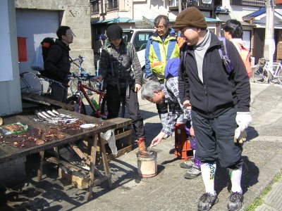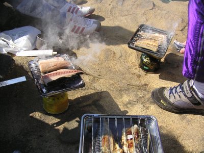 城ケ島の公園の外で、干物を焼きます。 大久保さんが100円ショップで金網を買ってきてくれました。 鯖、鯵、キンメ、皆おいしく食べました。また、マグロの頬肉もおいしかった。 |